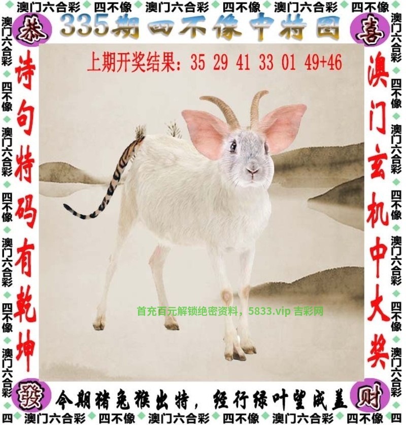337期:今期羊马猪出特,日日高楼看雁飞开發00准 ①杀牛猴狗 ②图解特肖羊马猪鼠兔 ③合双+大数 |